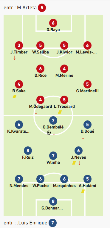 法国足球观察者队报给出了他们对于阿森纳0-1巴黎的各位球员评分——多纳鲁马8分,厄德高和萨卡4分。