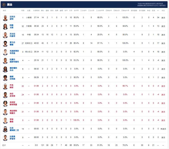 丹佛掘金贾马尔-穆雷43分5板7助,戈登23分4板2助,威少21分,约基奇13分10板12助;