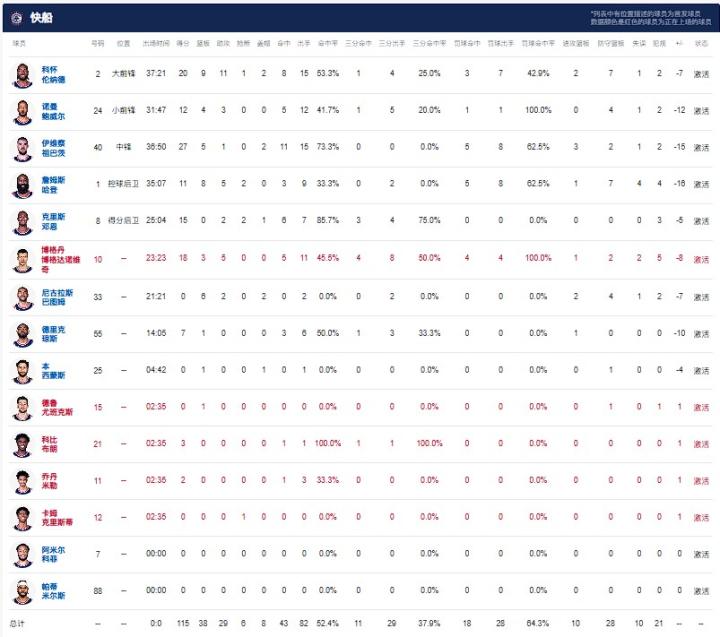 洛杉矶快船祖巴茨27分5板1助,莱昂纳德20分9板11助,博格丹18分3板5助,哈登11分8板5助。