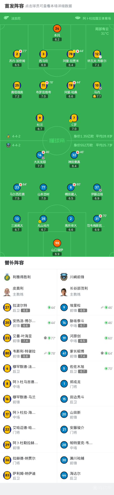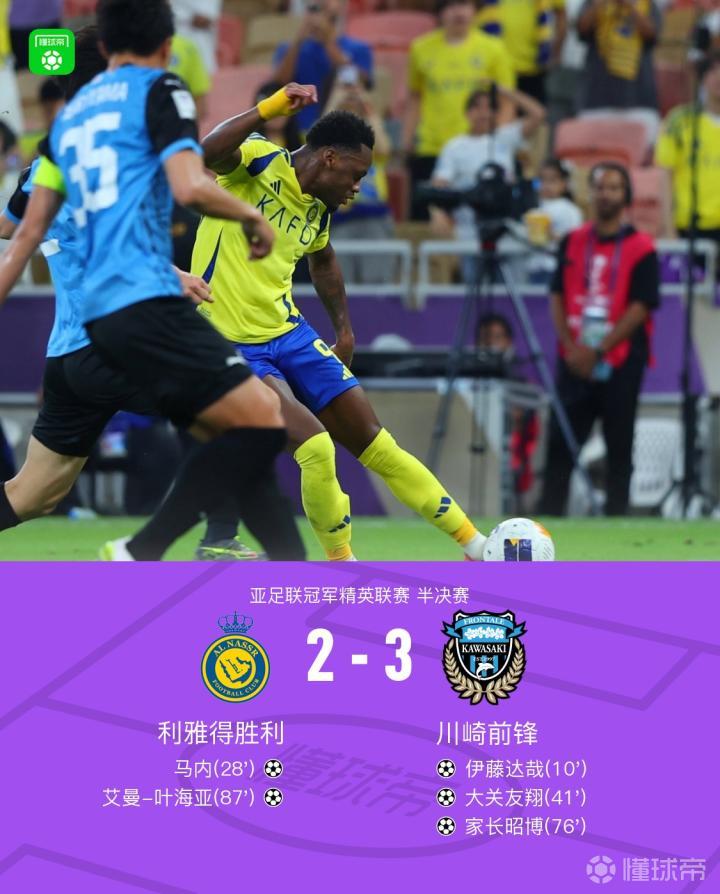 北京时间5月1日亚足联冠军精英联赛 半决赛,利雅得胜利对阵川崎前锋。上半场,伊藤达哉凌空抽射世界波先下一城,随后马内凭借个人能力内切扳平比分,上半场尾声阶段,大关友翔补射破门,助川崎前锋再次领先。下半场,家长昭博接埃里松助攻,轻松推射破门,比赛尾声阶段,叶海亚外围远射破门。最终比分利雅得胜利2-3川崎前锋。