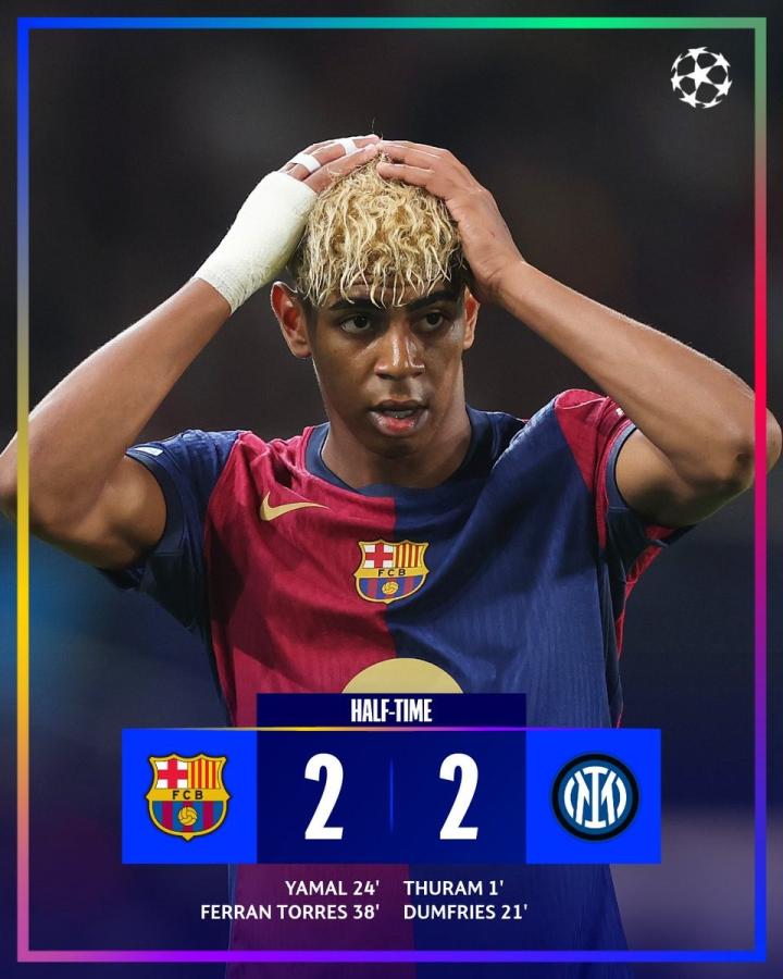 欧冠半决赛近25年来首次上半场出现4球,上次也有巴萨参与ETChalmers @懂球帝2025-05-01 04:05欧冠半决赛首回合,巴塞罗那主场对阵国际米兰,上半场战罢比分为2-2,这是自2000年以来首次出现欧冠半决赛上半场打入4球。本场比赛,国际米兰凭借马库斯-图拉姆和邓弗里斯各入一球取得2-0领先,巴塞罗那由亚马尔和费兰-托雷斯各入一球扳平比分。据统计,这是自2000年5月瓦伦西亚vs巴塞罗那以来,欧冠半决赛首次出现单场上半场产生4球的情况,当时也是出现4球。展开更多