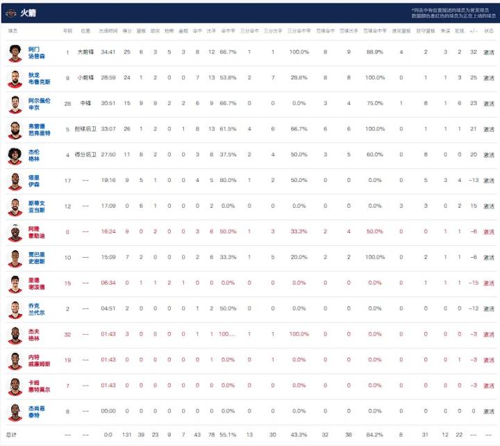 休斯顿火箭范弗利特26分1板2助,阿门-汤普森25分6板3助5断3帽,狄龙-布鲁克斯24分1板2助;