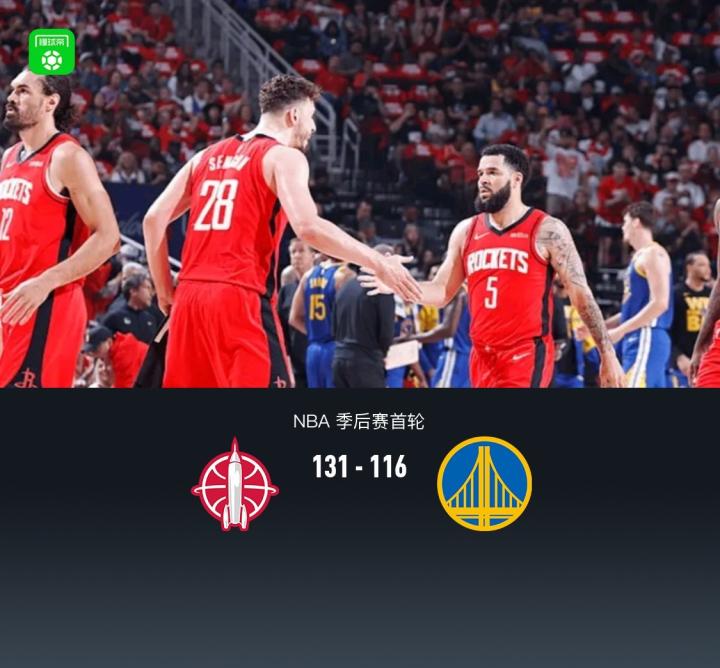 北京时间5月1日,NBA季后赛首轮G5火箭主场迎战勇士。开场火箭气势如虹攻守两端彻底压倒勇士,首节建立16分领先,次节火箭延续势头轰出36-25将分差彻底拉大,半场火箭76-49勇士,第三节前半节勇士反扑无果分差依旧维持30分上下,随后直接缴械投降换下主力,节末火箭也换下主力,而末节初勇士替补强势反扑追至20分以里,逼迫火箭换回主力稳住局面收下比赛,最终火箭131-116勇士,系列赛大比分2-3落后。