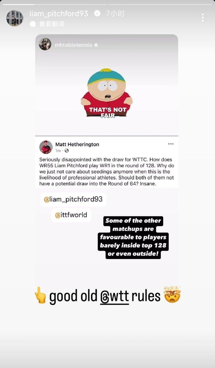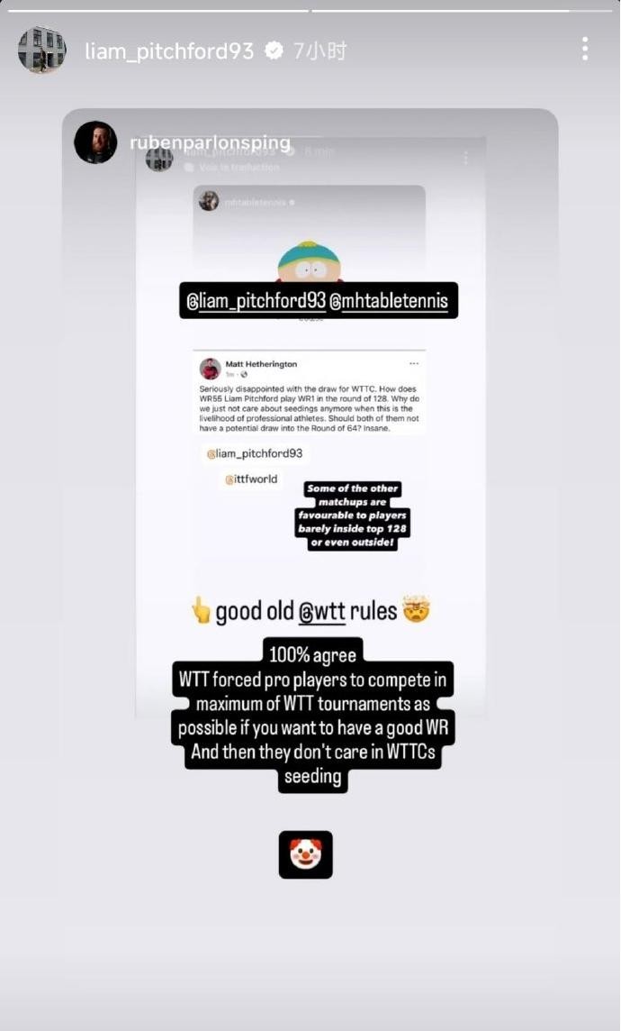 另外一名博主转发:“完全同意,WTT强迫职业选手尽可能多地参加其举办的赛事,这样才能获得好的世界排名。然后在世乒联锦标赛的种子排位上却又不重视(排名 )。”皮奇福德之后又转发了这则动态。