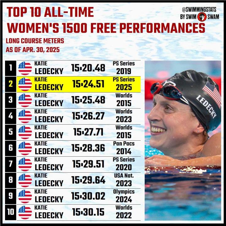 莱德基创女子1500米自由泳历史第二快成绩,一人包揽前22快我的靴子里面有蛇 @懂球帝2025-05-01 17:51北京时间5月1日凌晨,美国游泳系列赛劳德代尔堡站女子1500米自由泳决赛,名将莱德基游出历史第二快成绩,仅次于自己的七年前创造的世界纪录。本场比赛,美国名将莱德基游出15分24秒51,她在2019年创造了15分20秒48的世界纪录。另外更加恐怖的是,女子1500米自由泳历史前22好的成绩都是由她一人创造的。展开更多