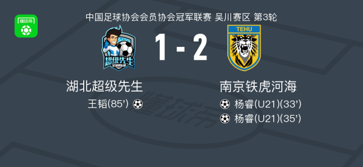 南京铁虎河海2-1湖北超级先生,杨睿包办2球