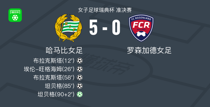 北京时间5月1日女子足球瑞典杯准决赛,哈马比女足对阵罗森加德女足。比赛中,布拉克斯塔两次攻破对方球门,埃伦-旺格海姆贡献一粒进球,坦贝格不仅梅开二度还在补时阶段通过点球机会帮助球队扩大领先优势。最终,哈马比女足以5-0战胜罗森加德女足。