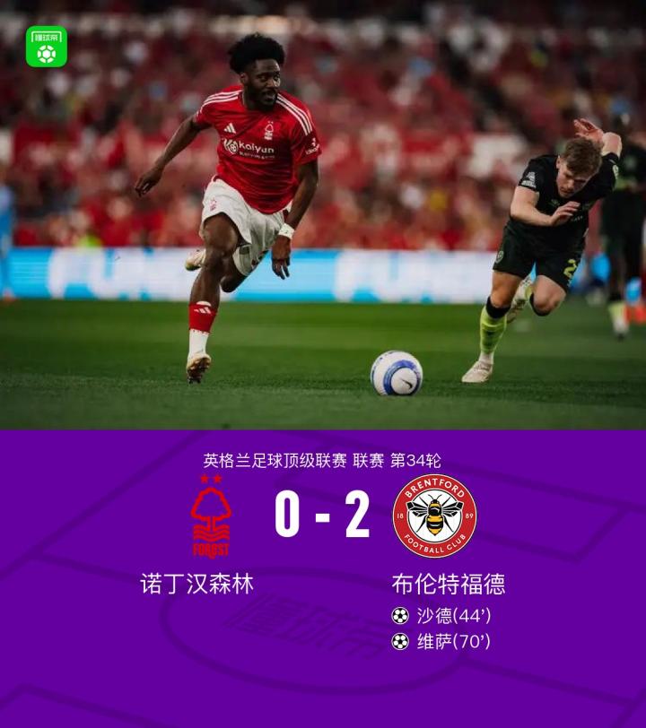 北京时间5月2日,英格兰足球超级联赛第34轮,诺丁汉森林主场迎战布伦特福德。比赛中,布伦特福德由沙德率先建功,随后维萨再下一城,帮助球队锁定胜局。最终,诺丁汉森林0-2不敌布伦特福德。