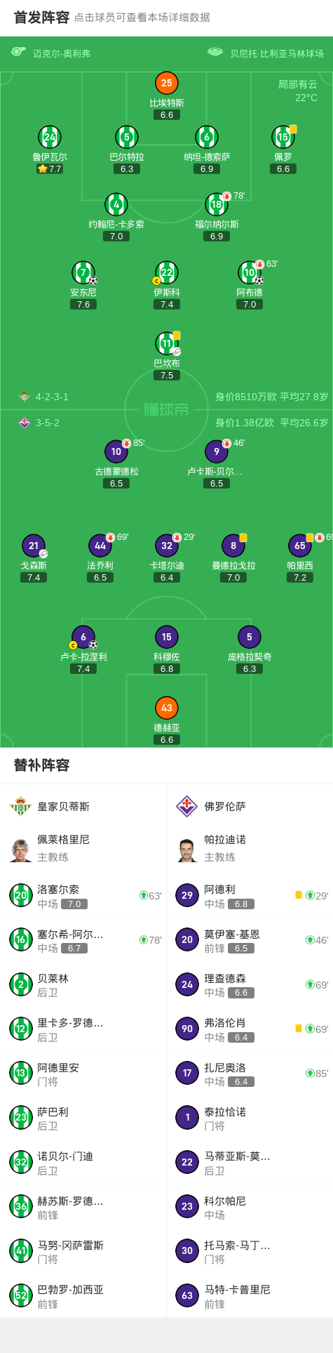 第8分钟,阿布德禁区抽射中柱后弹进球门,贝蒂斯1-0佛罗伦萨