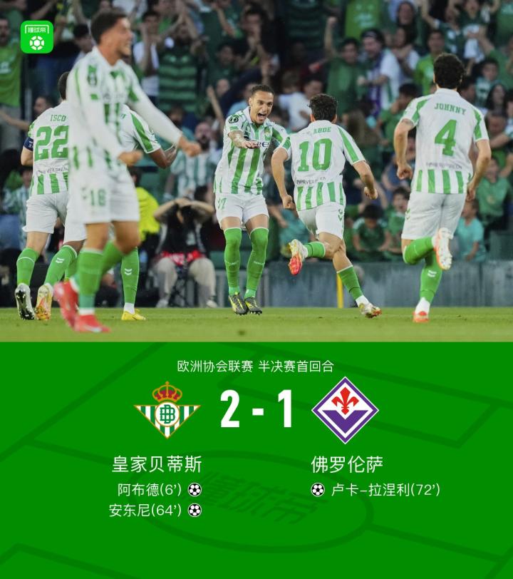 北京时间5月2日,欧洲协会联赛半决赛首回合,皇家贝蒂斯与佛罗伦萨展开较量。比赛中,皇家贝蒂斯由阿布德率先建功,随后安东尼再下一城扩大优势。佛罗伦萨则由卢卡-拉涅利扳回一球。最终,皇家贝蒂斯以2-1战胜佛罗伦萨。
