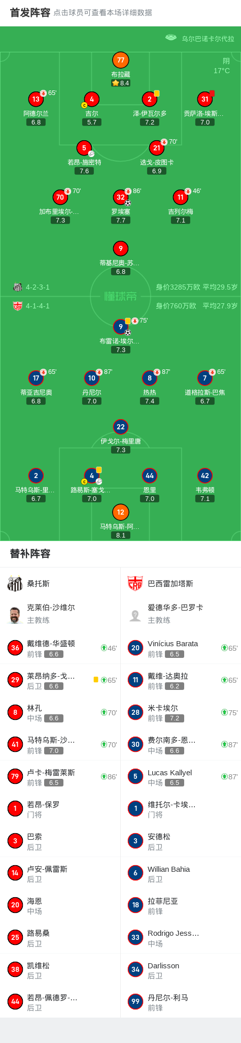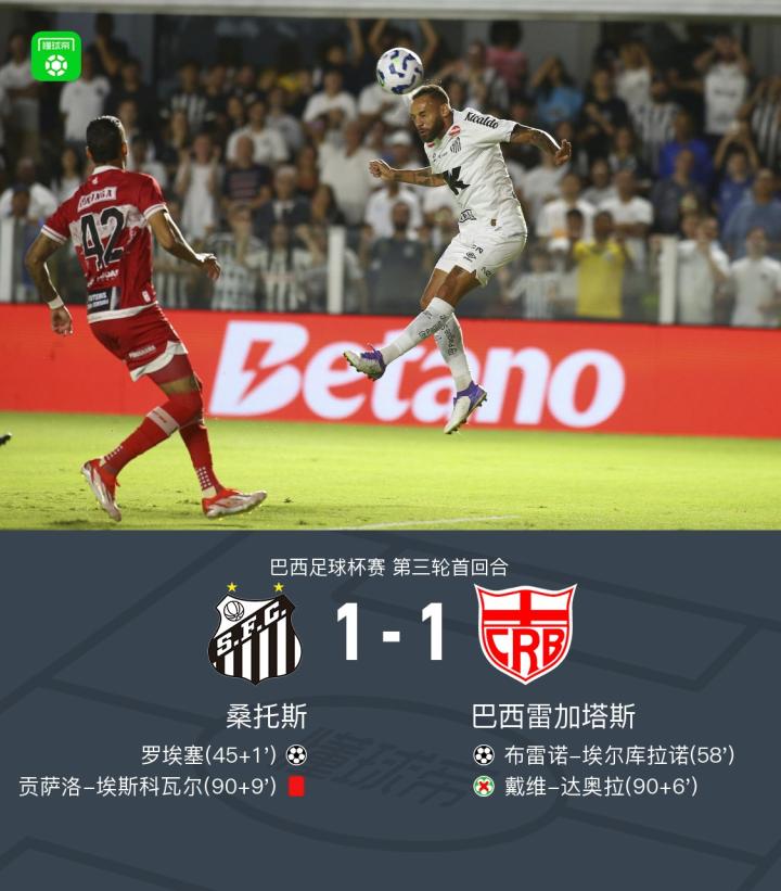 北京时间5月2日巴西足球杯赛 第三轮首回合,桑托斯对阵巴西雷加塔斯。桑托斯罗埃塞破门。巴西雷加塔斯布雷诺-埃尔库拉诺破门。最终比分桑托斯 1-1 巴西雷加塔斯。