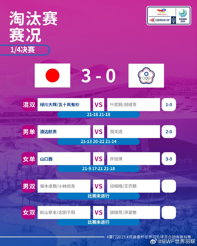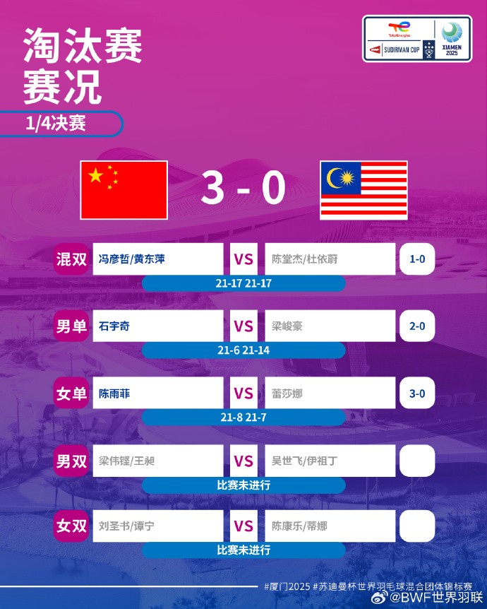 苏杯:国羽3-0战胜马来西亚,半决赛将对阵日本队gaoniu @懂球帝2025-05-02 13:175月2日,苏迪曼杯1/4决赛,中国队3-0战胜马来西亚,日本队3-0战胜中国台北队。半决赛中,中国队将与日本队争夺决赛入场券。 比赛将会在明天1号场地9点半进行。两队战绩展开更多