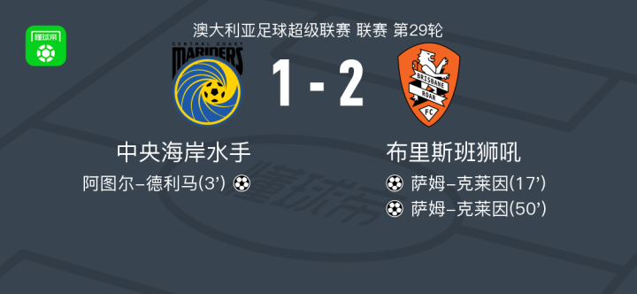 布里斯班狮吼2-1逆转中央海岸水手,萨姆-克莱因包办2球