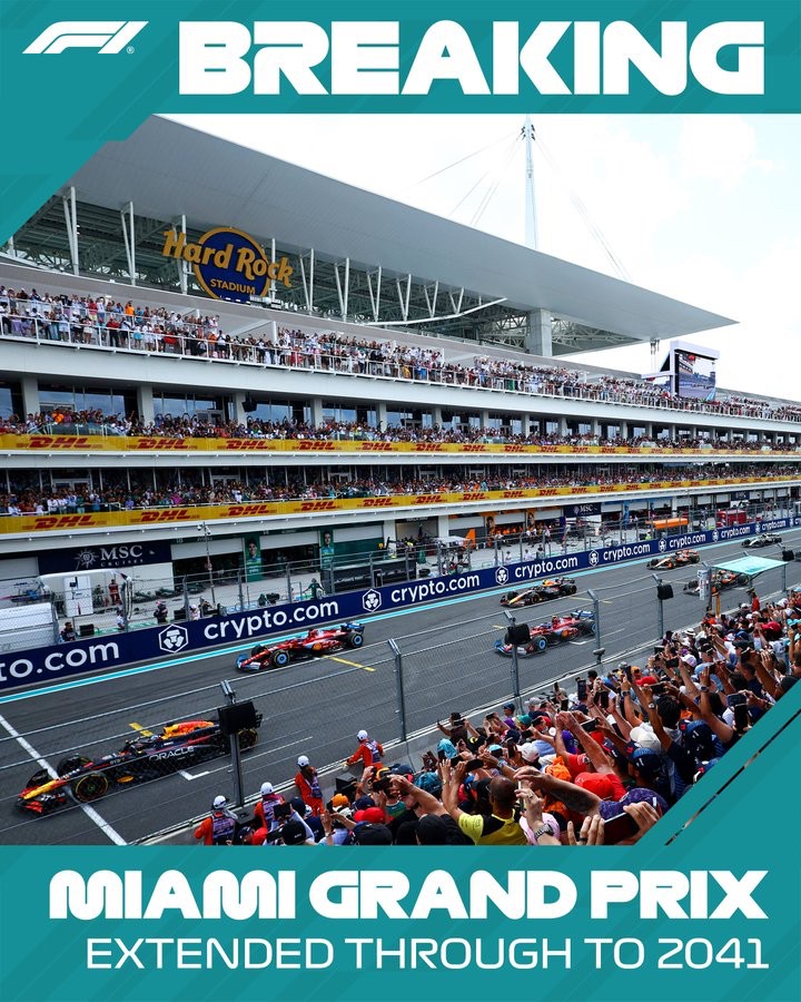 北京时间5月3日,F1官方宣布与迈阿密大奖赛在原有的合同上达成一份为期10年的新续约合同,大奖赛将一直保持在赛历上直至2041年。