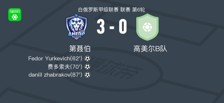 北京时间5月3日,白俄罗斯甲级联赛第6轮,第聂伯主场迎战高美尔B队。比赛中,第聂伯展现出强大攻势,Fedor Yurkevich为球队首开纪录,费多索夫随后扩大领先优势,daniil zhabrakov再入一球锁定胜局。最终,第聂伯以3-0战胜高美尔B队。
