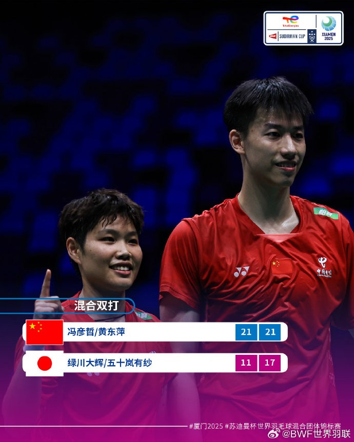 5月3日,2025苏迪曼杯半决赛中,第一场混双比赛,中国组合冯彦哲/黄东萍2-0战胜日本组合绿川大辉/五十岚有纱,为中国队拿下一分。 赛后冯彦哲以刀削面动作庆祝胜利复刻了2023年日本队的庆祝动作。