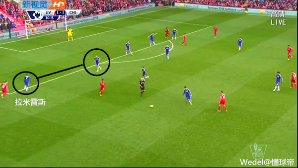 拉米雷斯本赛季受伤病困扰,鲜有上场机会。本场比赛他的上场,导致切尔西前场的压迫体系完成的不是很好。切尔西的前场压迫,目前只有迭戈-科斯塔、阿扎尔、威廉、奥斯卡、许尔勒五人完成得较好。而且必须是这五个人中四名球员同时上阵,才能有效地发挥出前场逼抢压迫的效果。之前对阵曼联时(前锋是德罗巴),前场压迫体系甚至趋于无效。本场比赛,拉米雷斯在压迫的配合上,做的也是不够出色。