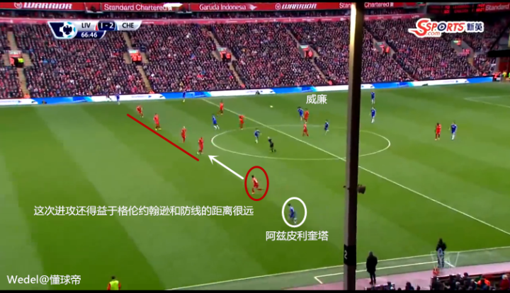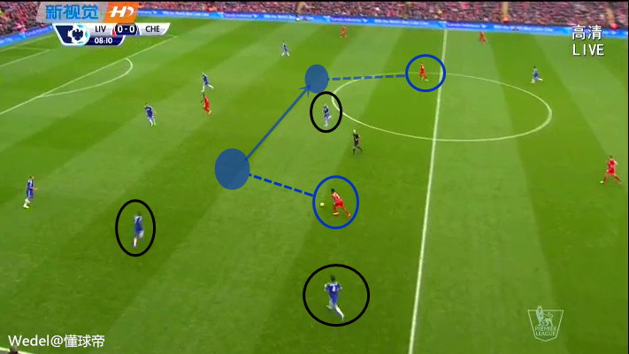 切尔西中场马蒂奇和法布雷加斯体能不足(比起赛季初的几场比赛而言),跑动覆盖面积下降不少。而一次失误,就导致了利物浦前插型大英中场的一次进球。这种纵向快速的前插能力,正是上赛季利物浦成功的至尊法宝之一。切尔西中路人数太少,被利物浦在中路捅了一个大窟窿。