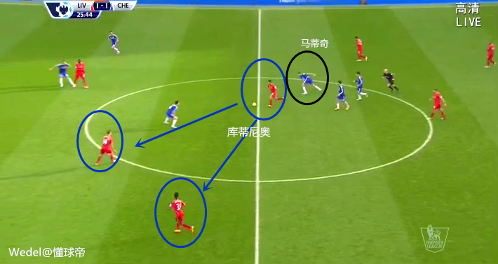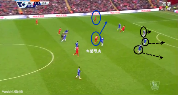 切尔西的前压,给予利物浦两个边路球员(斯特林和库蒂尼奥)巨大的空间。如果说穆里尼奥排上拉米雷斯是对斯特林的针对性设置,那么对库蒂尼奥,他的准备是不足的。