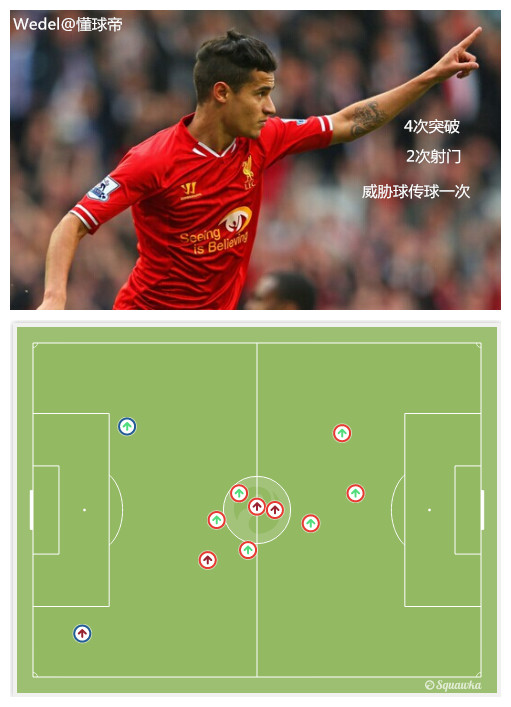 作为突破手,库蒂尼奥全场传球很少(只有15脚传球,11次传中目标,但下半场53分钟利物浦那次有威胁射门,正是他传出来的)。但每一次突破都威胁巨大,在突破切尔西中场之后,基本上面前都是一大片开阔地。没有中场球员的干扰,切尔西这种后撤型防线,疲于应付。