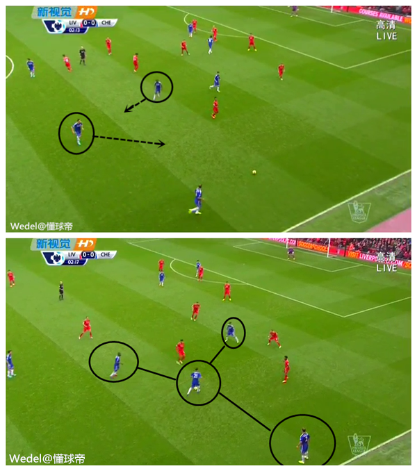同时,压缩阵型,通过换位,在局部区域制造人数优势,加上球员个人能力的优势,这样的节奏变化很容易制造威胁。大范围的换位,在反击过程中使用威胁更大。特别是两个边锋的换位,时常导致对方盯防球员被带到同一区域,防守球员人数虽多,却不能对持球球员保持有效的压迫与包夹。这种战术设计,每一位切尔西球员在跑到接球位置时,都有足够的持球空间,而对方的盯人球员,在速度转换的瞬间防守区域重叠。这也是如今切尔西最强大的地方之一。