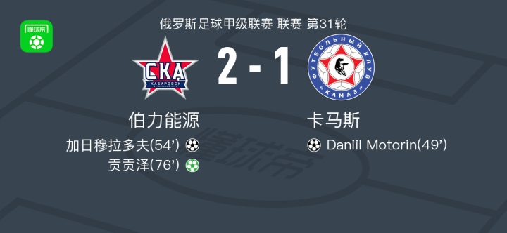 北京时间5月3日,俄罗斯足球甲级联赛第31轮,伯力能源主场迎战卡马斯。比赛中,卡马斯由Daniil Motorin率先取得进球,但伯力能源迅速展开反击,加日穆拉多夫为球队扳平比分,随后贡贡泽通过点球完成反超。最终,伯力能源以2-1战胜卡马斯。