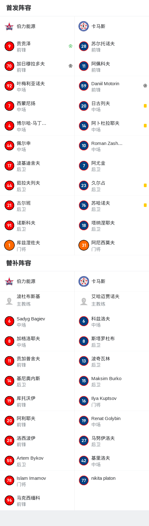 伯力能源2-1逆转卡马斯,贡贡泽点射、加日穆拉多夫破门