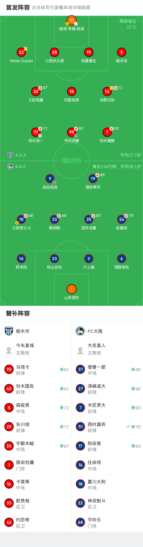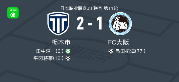 北京时间5月3日日本职业联赛J3 联赛 第11轮,枥木市主场对阵FC大阪。枥木市田中淳一破门,平冈将豪破门。FC大阪岛田拓海破门。最终比分枥木市 2-1 FC大阪。