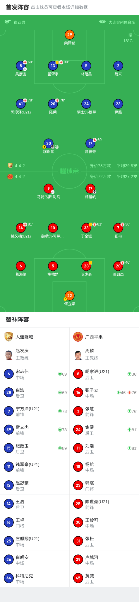 北京时间5月3日中国足球甲级联赛 联赛 第7轮,大连鲲城主场对阵广西平果。大连鲲城穆谢奎梅开二度。广西平果杨镜帆破门。最终比分大连鲲城 2-1 广西平果。