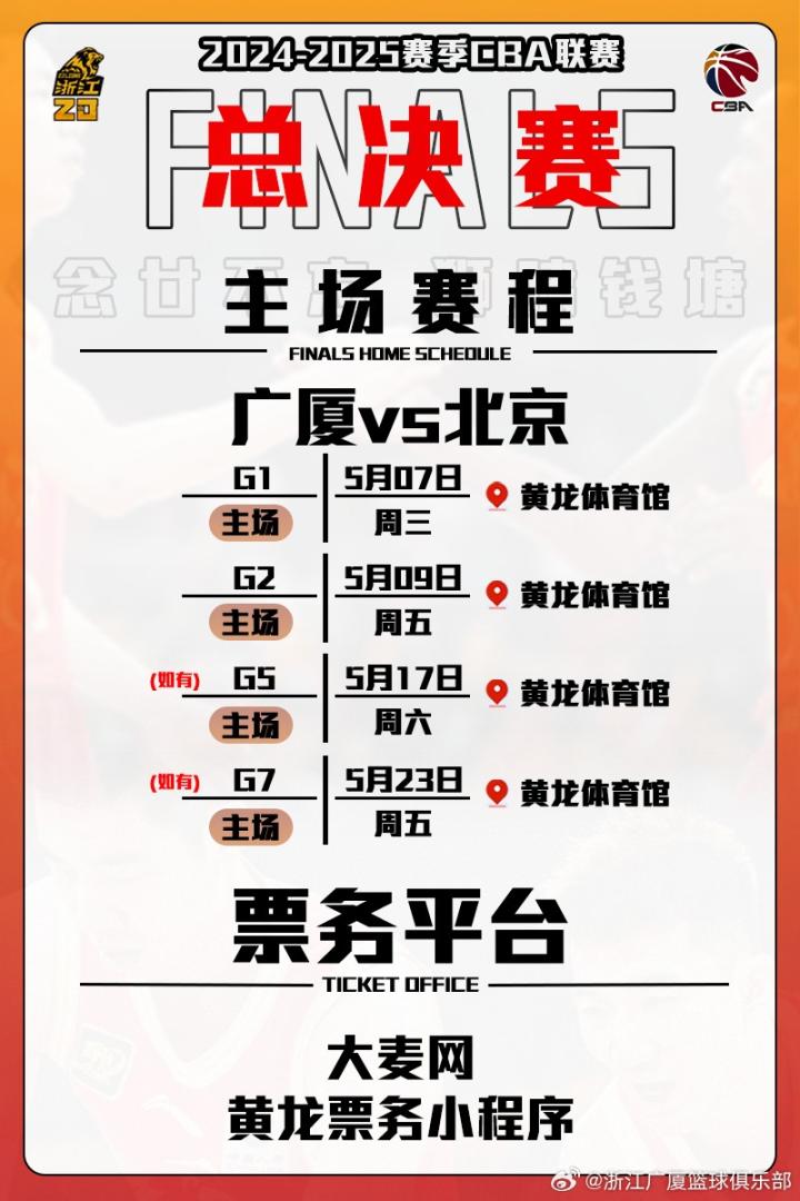 5月2日晚,CBA季后赛半决赛落下帷幕,浙江广厦和北京男篮会师总决赛。广厦官方发布消息,5月7日G1和5月9日G2两场的主场门票将于5月5日同时开售。
