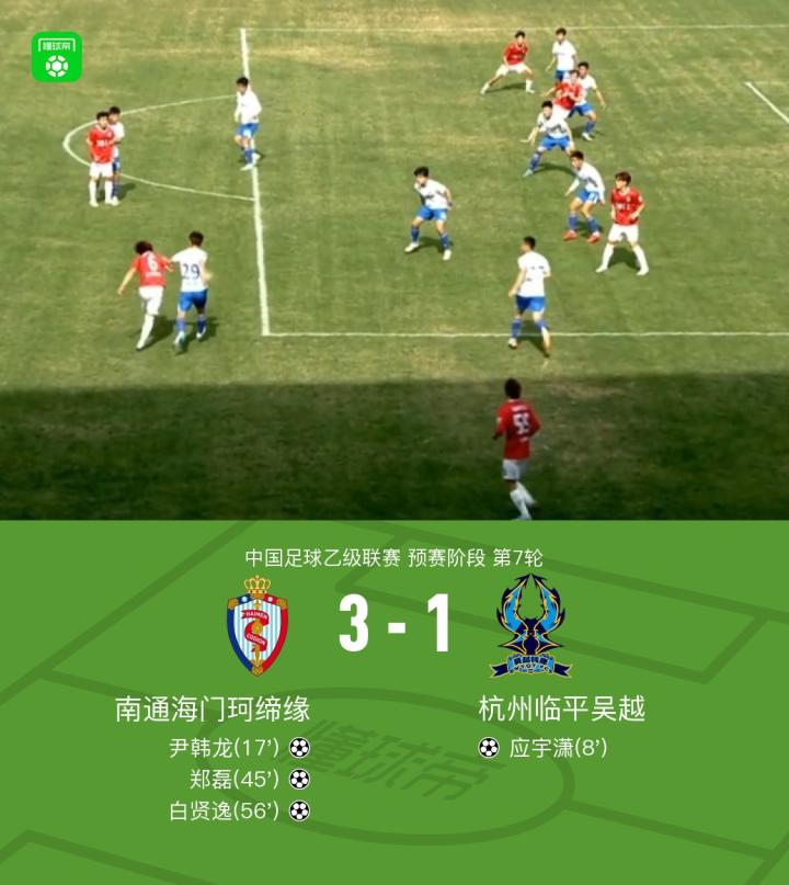 北京时间5月3日,中国足球乙级联赛预赛阶段第7轮,南通海门珂缔缘主场迎战杭州临平吴越。比赛中,杭州临平吴越由应宇潇率先取得进球。随后,南通海门珂缔缘展开反击,尹韩龙、郑磊和白贤逸接连建功,帮助球队实现逆转。最终,南通海门珂缔缘以3-1战胜杭州临平吴越。