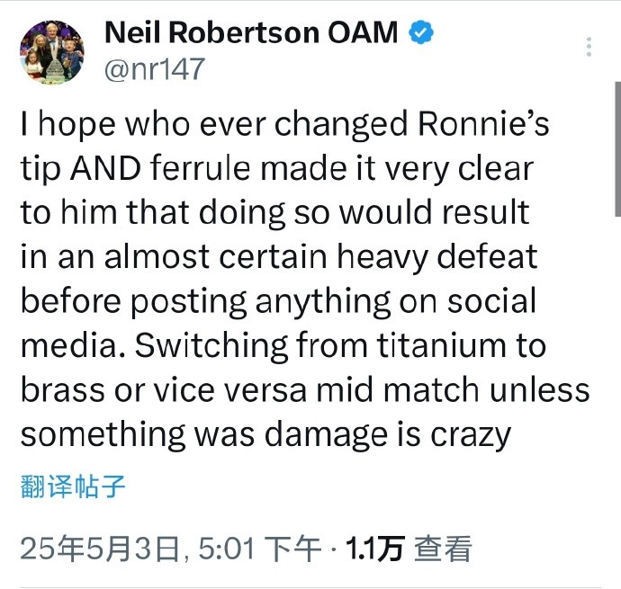 罗伯逊社媒发文:“在社交媒体上发文之前,希望给罗尼更换皮头和先角的人明确告知过他,这样极可能导致惨败,除非有损坏,比赛中途把钛合金配件换成黄铜材质(或者反过来),这太疯狂了。”