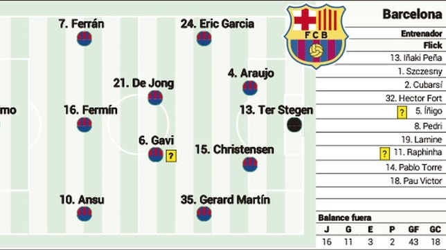 该报道指出,考虑到下周巴萨还将面对欧冠半决赛次回合客战国米的关键比赛,此战弗里克将会让什琴斯尼、库巴西、伊尼戈-马丁内斯、佩德里、亚马尔以及拉菲尼亚轮休,特尔施特根、阿劳霍、克里斯滕森、加维、费尔明-洛佩斯以及法蒂将会首发,受伤的孔德则会被埃里克-加西亚取代。