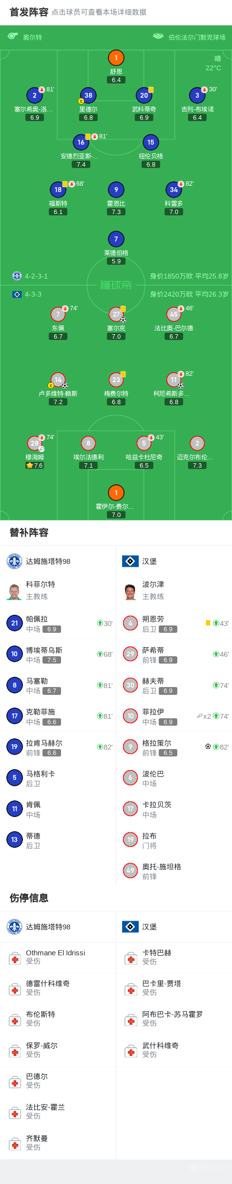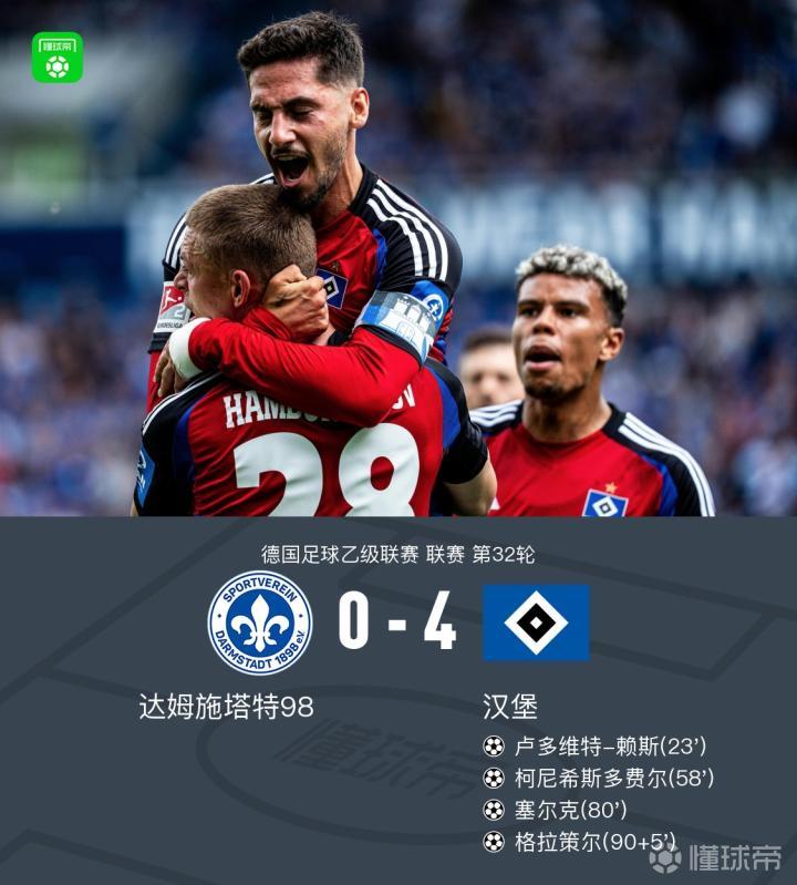 下轮取胜即可重返德甲!汉堡4-0大胜达姆施塔特,塞尔克建功