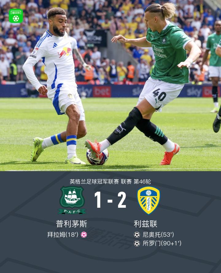 北京时间5月3日,英格兰足球冠军联赛第46轮,普利茅斯主场迎战利兹联。比赛中,利兹联出现意外情况,拜拉姆不慎将球送入自家球门;不过利兹联迅速调整,尼奥托为球队扳平比分,并在补时阶段助攻所罗门完成逆转。最终,利兹联2-1逆转普利茅斯,惊险夺得本赛季英冠冠军!