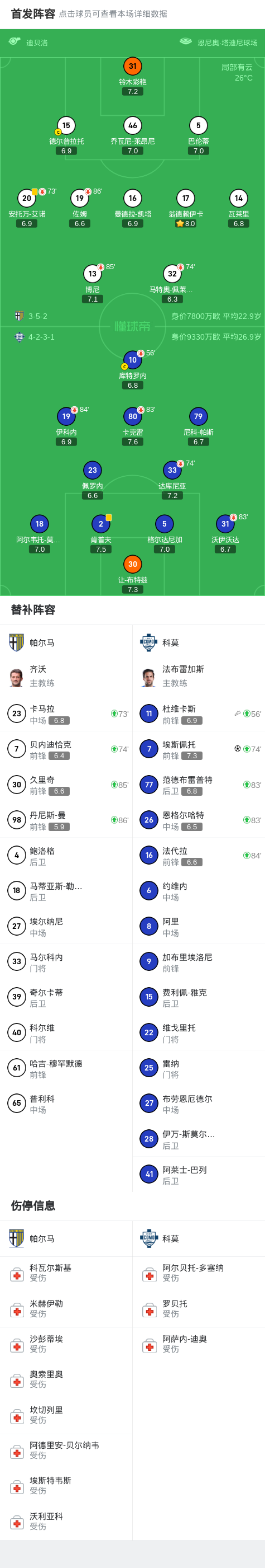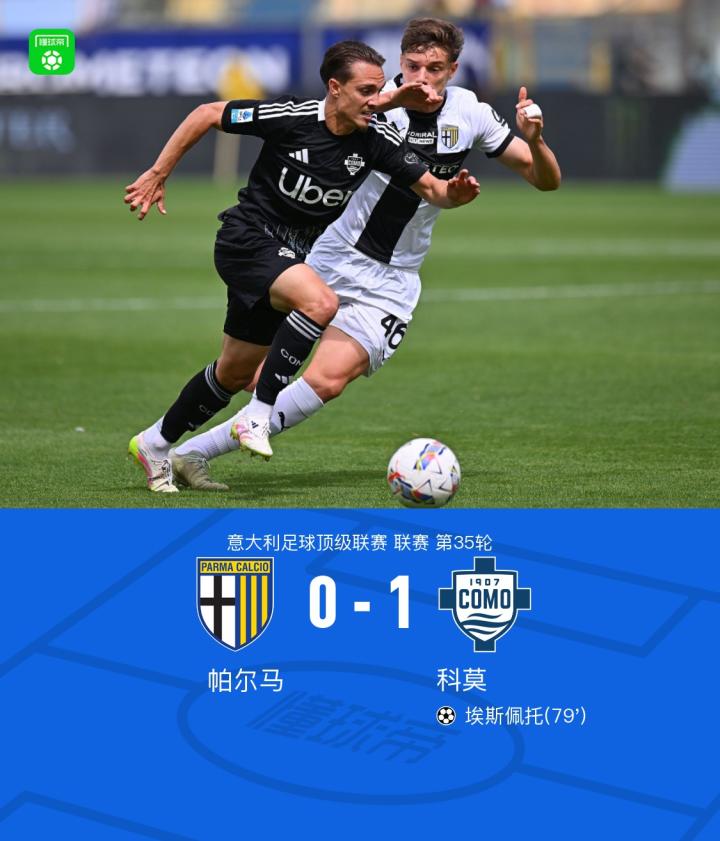 科莫1-0客胜帕尔马,埃斯佩托一剑封喉战报bot @懂球帝2025-05-03 22:58北京时间5月3日,意大利足球顶级联赛第35轮,帕尔马主场迎战科莫。比赛中,科莫由埃斯佩托完成进球,帮助球队取得领先。最终,帕尔马0-1不敌科莫。点击查看本场比赛详细数据>>点击查看意甲完整积分榜>>精彩瞬间第79分钟,科莫球员杜维卡斯助攻埃斯佩托打入一球。 球队阵容 技术统计 展开更多