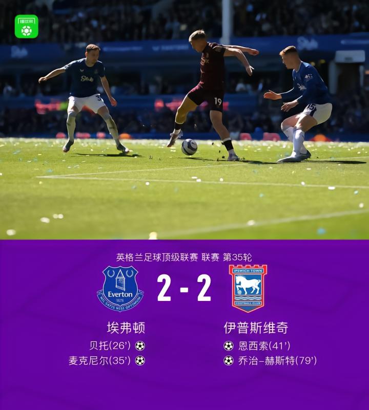 北京时间5月3日晚间22:00,英超联赛第35轮,埃弗顿坐镇主场迎战伊普斯维奇。上半场,贝托头球打破僵局,麦克尼尔世界波扩大比分,恩西索同样用世界波还以颜色。下半场,乔治-赫斯特头球扳平比分。最终,埃弗顿2-2伊普斯维奇。