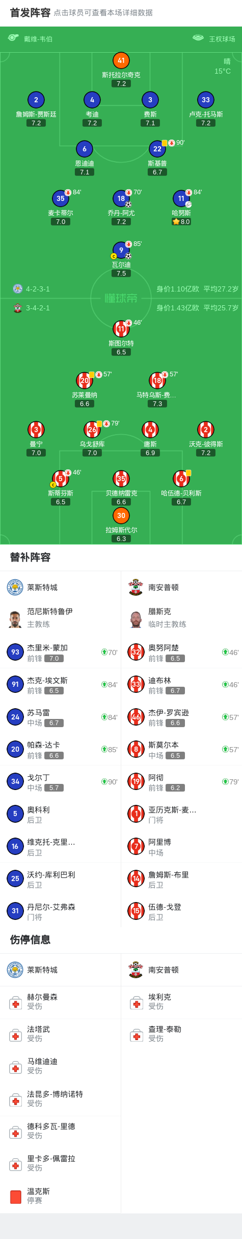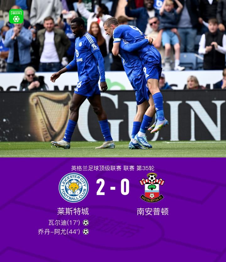 北京时间5月3日晚间22:00,英超联赛第35轮,莱斯特城主场对阵南安普顿。上半场,瓦尔迪打入自己莱斯特城生涯第199球,主裁判戴维-韦伯被乔丹-阿尤撞伤,乔丹-阿尤扩大比分。下半场,马特乌斯-费尔南德斯破门被吹。最终,莱斯特城2-0南安普顿。