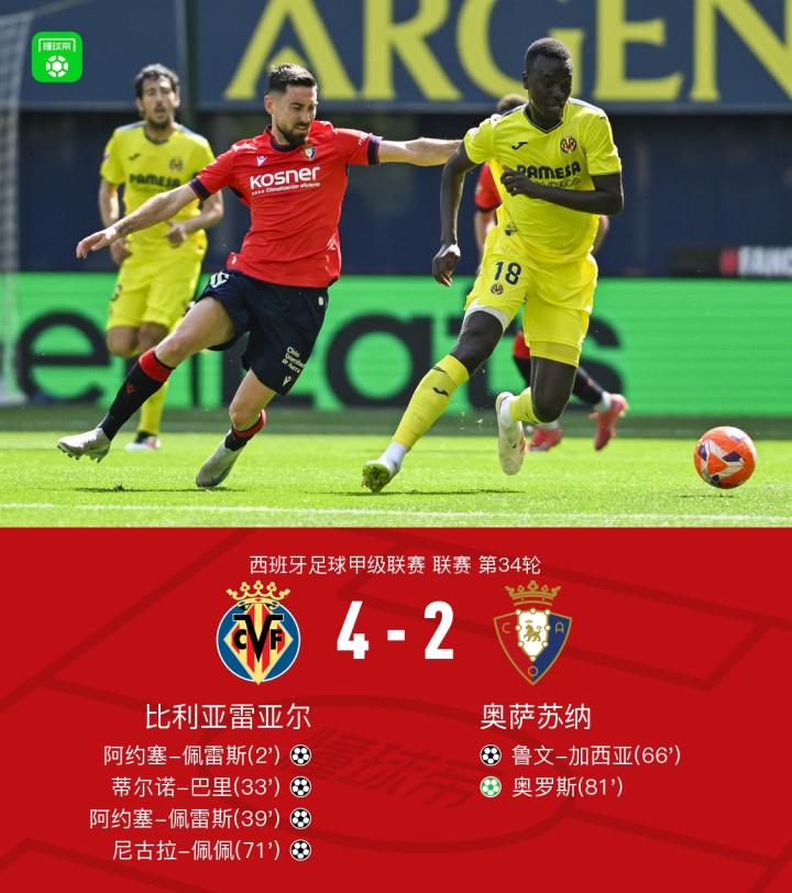 北京时间5月3日,西班牙足球甲级联赛第34轮,比利亚雷亚尔主场迎战奥萨苏纳。比赛开始后,比利亚雷亚尔迅速取得领先,阿约塞-佩雷斯首开纪录,随后蒂尔诺-巴里再下一城扩大优势。不久后,阿约塞-佩雷斯再次建功完成梅开二度。尽管鲁文-加西亚为奥萨苏纳扳回一球,但尼古拉-佩佩的进球帮助比利亚雷亚尔重新拉开分差。比赛尾声阶段,奥罗斯通过点球为奥萨苏纳再追一球,但未能改变最终结果。全场比赛结束,比利亚雷亚尔以4-2战胜奥萨苏纳。