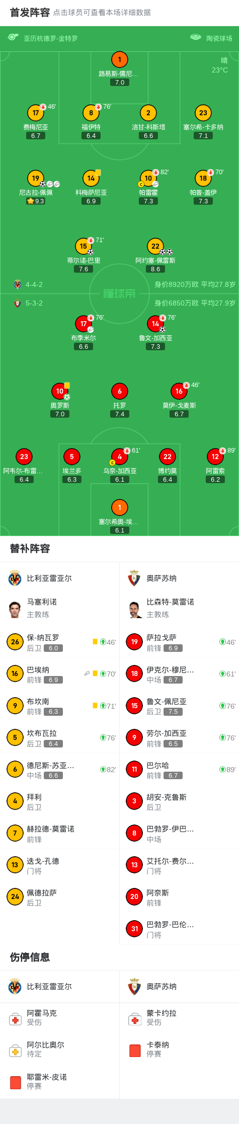 比利亚雷亚尔4-2奥萨苏纳,阿约塞-佩雷斯双响,佩佩建功