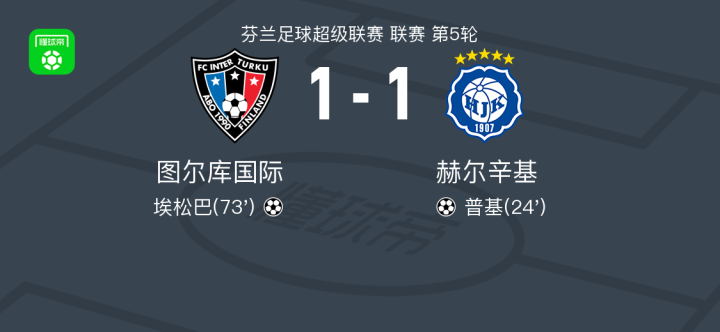 北京时间5月3日,芬兰足球超级联赛第5轮,图尔库国际主场迎战赫尔辛基。比赛中,赫尔辛基由普基率先打破僵局,随后图尔库国际的埃松巴成功扳平比分。最终,双方以1-1的比分握手言和。