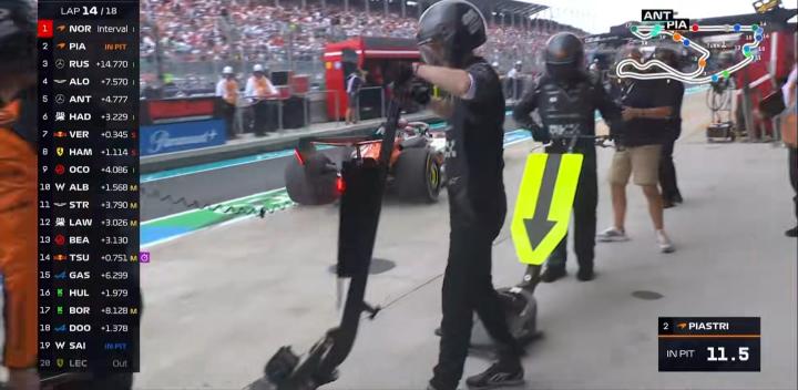 第14圈:皮亚斯特里、拉塞尔、哈贾尔、阿隆索先后进站换干胎;
