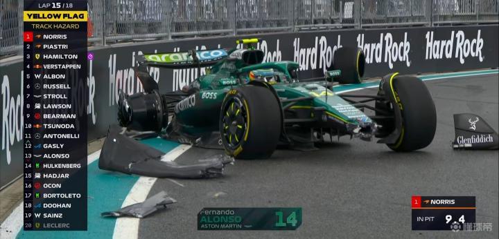 第15圈:阿隆索与劳森发生碰撞后上墙,赛车严重受损,赛会出动安全车!