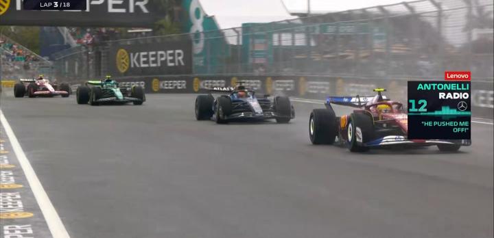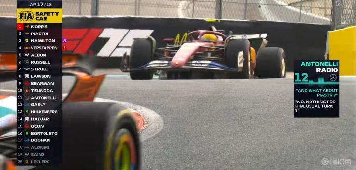 安东内利的发车不够理想,与皮亚斯特里在1号弯展开激烈争夺后冲出赛道,排名下降到第4名!