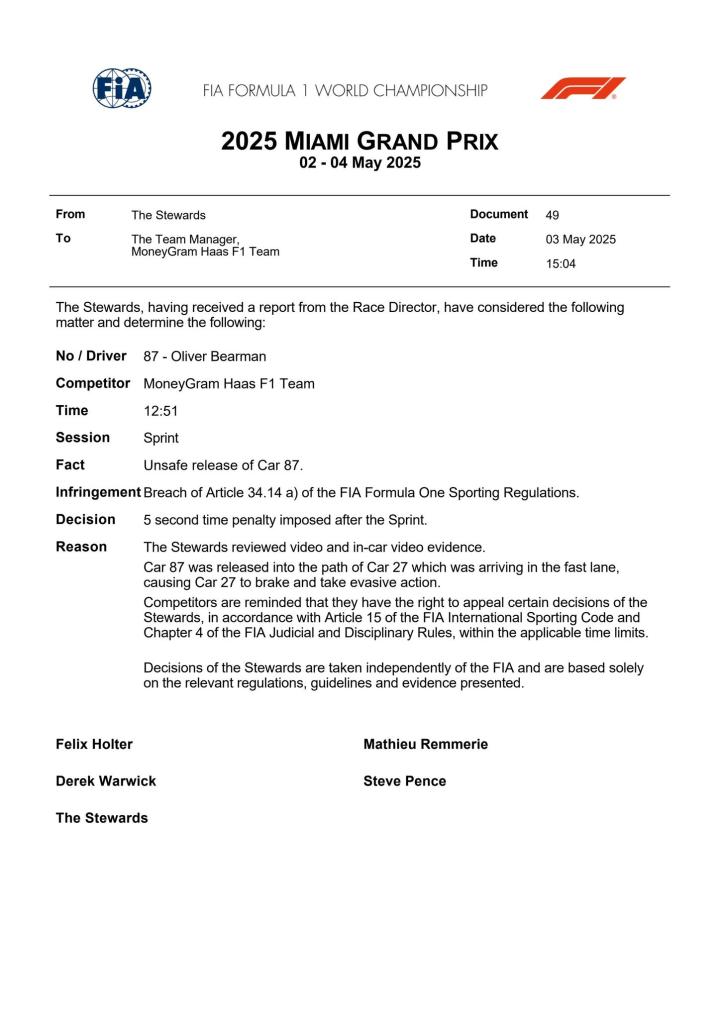 贝尔曼因车队的不安全释放被罚时5秒,排名从第8降至第14,此前收获的1分被剥夺!