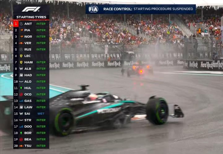 起步轮胎方面:塞恩斯全雨胎,其他选手都使用半雨胎;