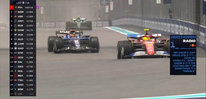 第9圈:维斯塔潘表示自己的头盔护目镜存在问题,他的视野非常糟糕;