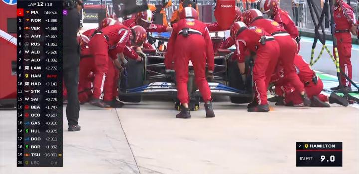 第12圈:汉密尔顿、塞恩斯、斯特罗尔进站换干胎,只有汉密尔顿使用了软胎;