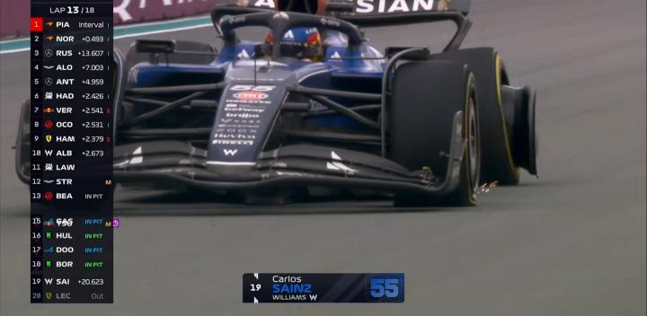 镜头给到塞恩斯,他的轮胎出现爆胎的状况,赛会在之前曾短暂出示黄旗!