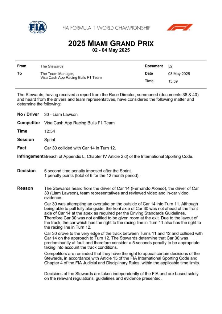 劳森因在超车时将阿隆索撞出赛道,被赛会罚时5秒,同时超级驾照扣1分(12个月中的第6分),排名掉到第13!